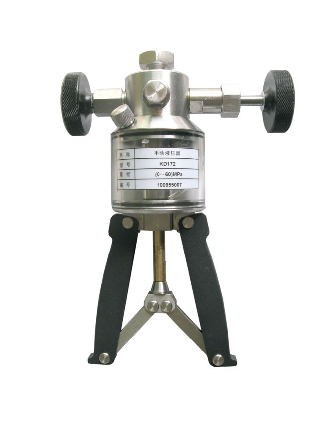 手操压力泵是有手柄,活塞杆。透气体,泵盖,放油手把,微调手把,表接头等组成。旋转放油手把关闭放油阀,手握手操压力泵手柄,用力握紧,放松反复进行,从而带动活塞杆往复运动,活塞杆往复运动几次就可以产生输出压力0-60Mpa。